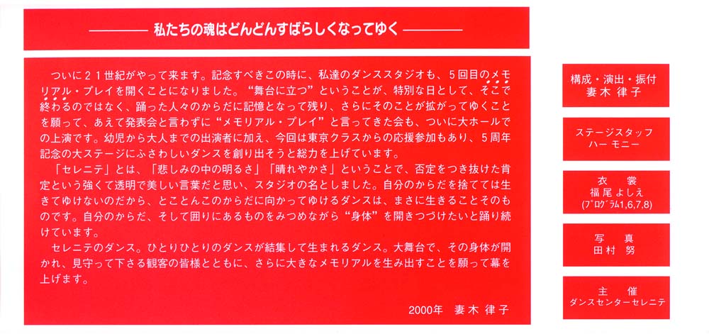 妻木先生は宇都宮ご出身で都内の学校へ進まれ、文化庁派遣在外研修員としてニューヨークでマース・カニングハムの教えを受けたバリバリのコンテンポラリーダンサーです。毎年ご自身の作品を発表して高い評価を受けていらっしゃるほか、セレニテなどで若い人たちを教え、またオープニングワークスの代表としてもご活躍です。 今回はスタジオ公演5回目の節目にあたり、特に大きな舞台で日頃の成果を披露なさるばかりでなく、ご自身でも舞台に立たれるとのことです。コンテンポラリーがお好きな方はぜひどうぞ。当日は入場無料、全席自由です。開催趣旨や詳しい内容については左のプログラムをクリックして拡大画像を見てください。 |